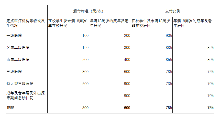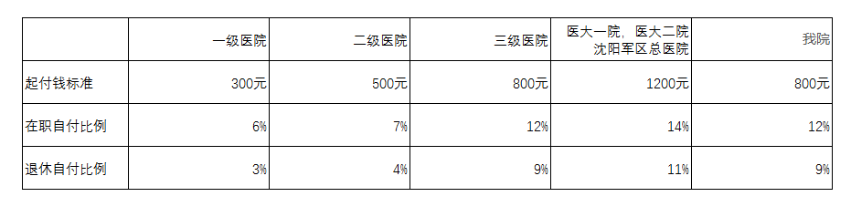 ※住院:在定点医院住院,需预先交纳统筹基金起付标准及个人承担比例部分(见下表),并将医保卡/社保卡、身份证复印件交定点医院审核。如出现身份证与卡名字不符时,参保人员应到沈阳市医疗保障事务服务中心修改正确(同音不同字除外)。起付标准每次住院递减15%,1年内最多不得超过2次。起付标准以内的费用由参保人员个人负担。住院所发生的符合基本医疗保险药品目录、诊疗项目、医疗服务设施范围和支付标准的医疗费用由统筹基金按规定比例予以支付;超出部分,统筹基金不予支付。使用乙类目录的药品和支付部分费用的诊疗项目所发生的费用,由个人先行自付一定比例后,再按所住医院等级支付个人承担比例部分。出院结算时,个人自付金额由个人账户或现金支付;统筹基金支付金额,由医院与沈阳市医疗保障事务服务中心进行结算。办理出院结算需持患者本人医保卡/社保卡。