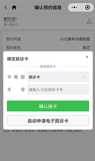 Step 3:在弹窗中输入【就诊卡卡号】,确认绑卡;或点击【自动申请电子就诊卡】。