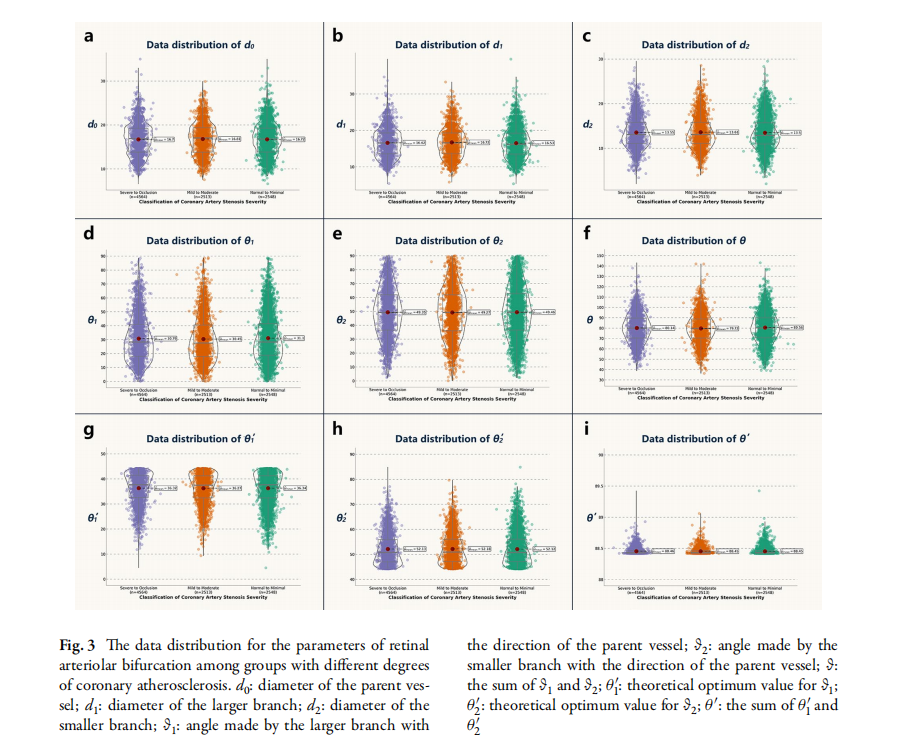 在此次研究中,444名研究参与者的731张眼底照片经过了蜻蜓健康自主研发的眼健康AI进行了详尽分析,产生了超过9600个可测量的视网膜动脉分叉点。研究表明,在严重冠状动脉狭窄患者中,其视网膜小动脉分叉角度偏离了理论上的最佳值,这种偏差可能是未来心脏病发作的一个重要预兆。