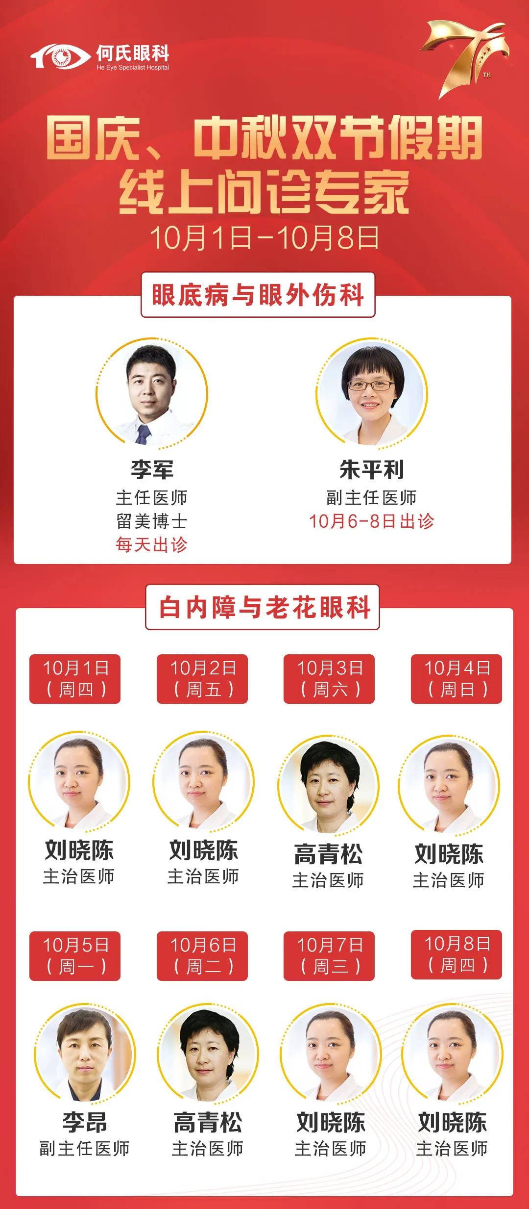 【喜迎双节】节日不休息,“何”你一起守护眼健康 发布时间:2020-09-30 13:50:45 来源:何氏眼科 总有一种关爱,就在你身边总有一种保障,让你倍感安心沈阳何氏眼科医院10月1日至10月8日正常出诊十一、中秋双节到我们为您的眼健康保驾护航除此之外线上问诊持续开通如果您不便出门也可以在线上与医生交流更多关爱 · 何氏相伴